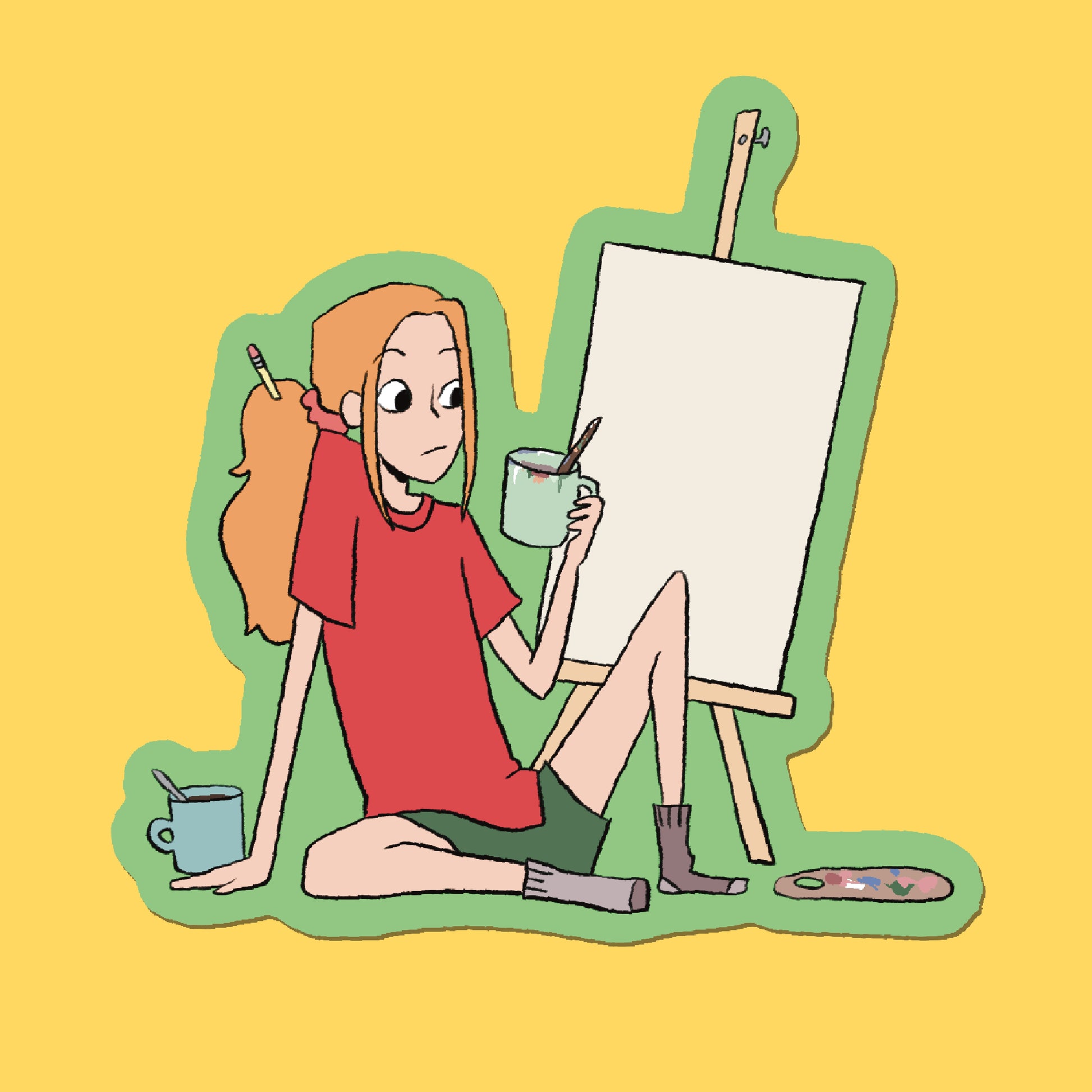 Kara sits in front of a daunting, blank canvas with her mug of- paint water. She wonders how much of that she has drank.